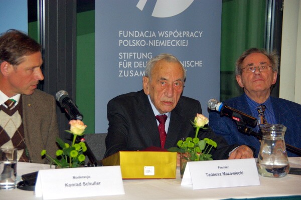 Am 7. November diskutierten Polens ehemaliger Ministerpräsident Tadeusz Mazowiecki und der frühere Ratsvorsitzende der Evangelischen Kirche Deutschlands Bischof Huber in der Deutschen Botschaft mit zahlreichen prominenten Gästen über das Buch von Anna Morawska „Dietrich Bonhoeffer - Ein Christ im Dritten Reich“ und Wege des Widerstands gegen Unrecht.