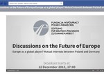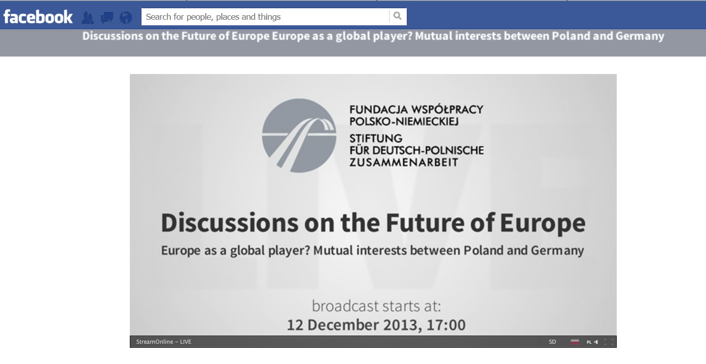 Am 12.-13. findet in der SdpZ eine Expertendebatte zur Zukunft Europas statt. Das erste Diskussionspanel „Europe as a global player? Mutual interests between Poland and Germany” wird am 12. Dezember 2013 zwischen 17.00-19.00 Uhr auf der Website www.fwpn.org.pl sowie im FB-Profil unserer Institution live übertragen. Wir laden Sie herzlich zur Teilnahme ein!
