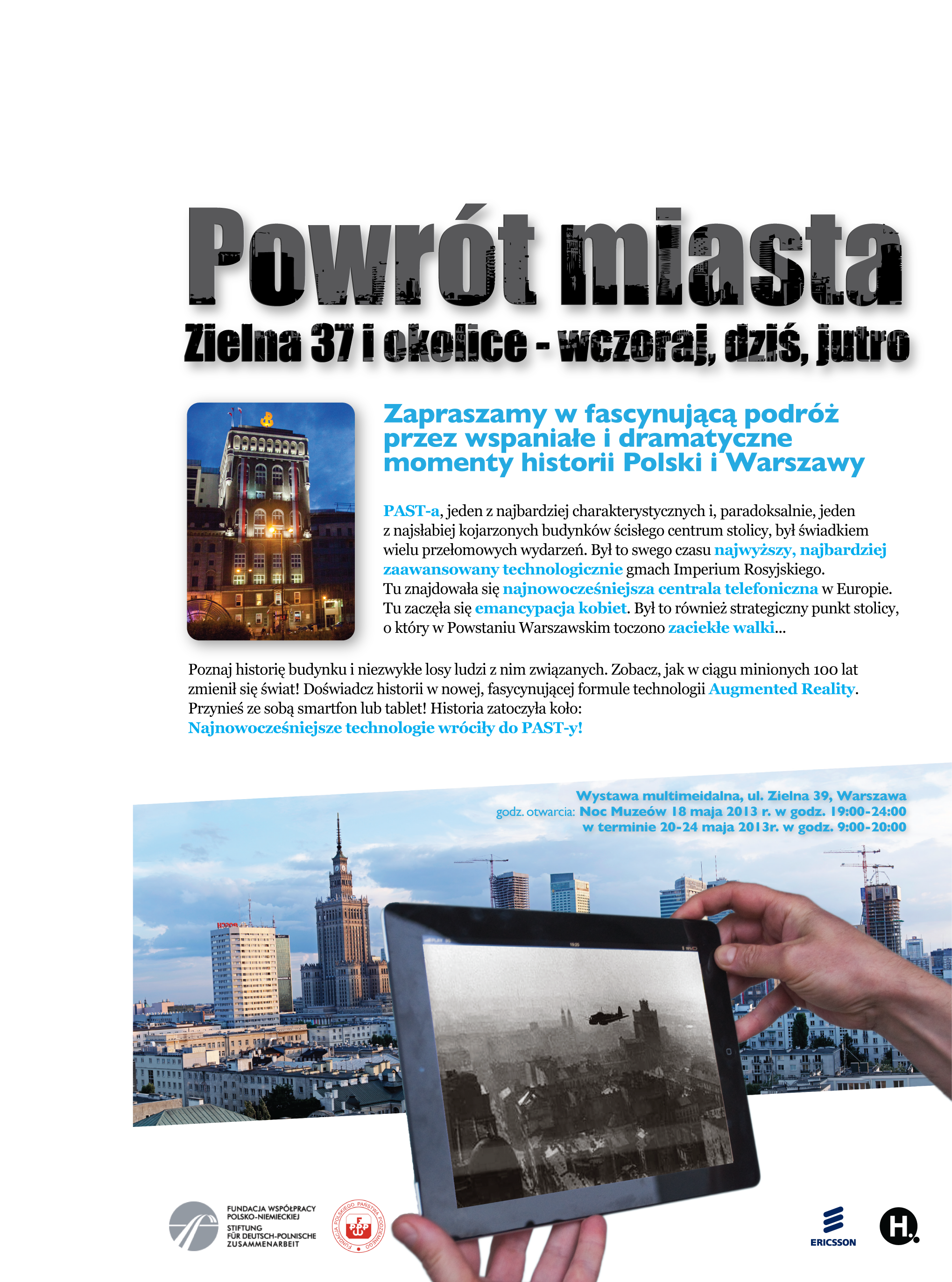 Die SdpZ und die Stiftung des Polnischen Untergrundstaates (FPPP), Verwalter des historischen Gebäudekomplexes in der Zielna-Straße 37 und 39, das seinen Namen vom ehemaligen Nutzer, der polnisch-schwedischen Telefongesellschaft PAST (Polska Akcyjna Spółka Telefoniczna) erhielt, luden die Bewohner der Hauptstadt zur Präsentation der Ausstellung „Rückkehr einer Stadt. Zielna 37 und Umgebung – gestern, heute, morgen“ von Thomasz Markiewicz ein. Sie wurde am Samstag, den 18. Mai im Rahmen der Langen Nacht der Museen im Zentrum für Historische Bildung der FPPP in Warschau gezeigt. Die Ausstellung übermittelt auf Polnisch, Deutsch und Englisch Geschichten über Grzybów und die Gegend um die Zielna-Straße in den vergangenen 150 Jahren. Die Organisatoren haben darüber hinaus im Rahmen der Ausstellung eine multimediale Überraschung vorbereitet: das erste Mal wurde in Warschau die virtuelle Technologie Augmented Reality vorgestellt – es lohnte sich also, ein Smartphone oder Tablet dabei zu haben!