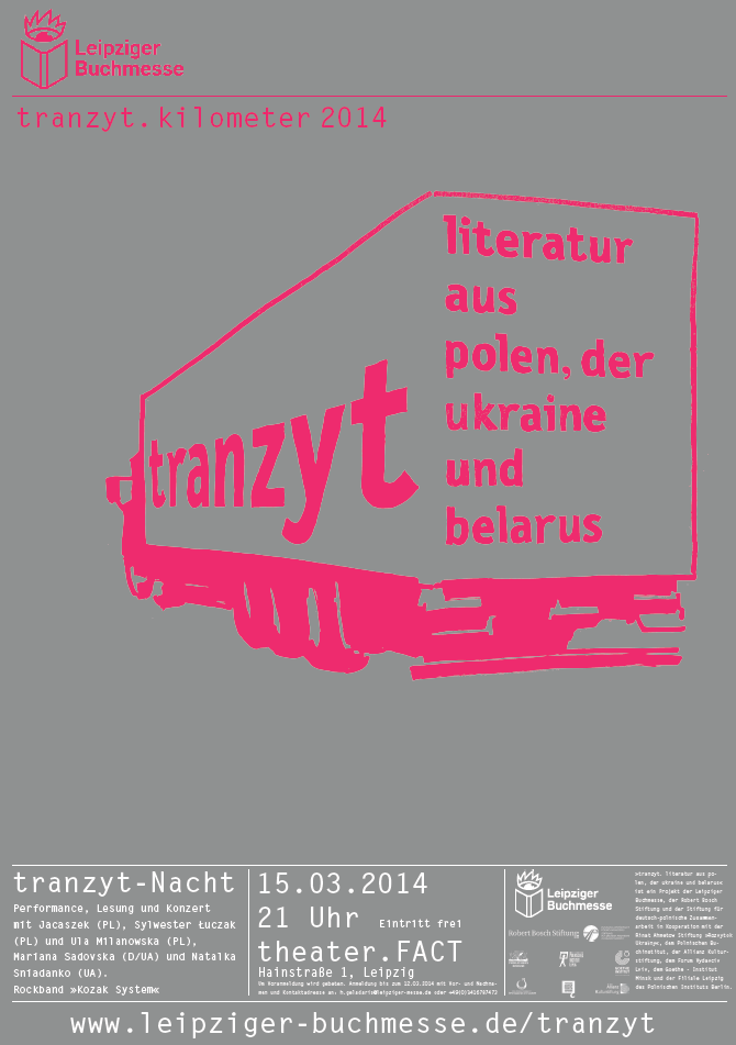 „TRANZYT“ ist ein Projekt der Leipziger Buchmesse, der Robert Bosch Stiftung und der Stiftung für deutsch-polnische Zusammenarbeit in Kooperation mit der Rinat Ahmetov Stiftung "Rozvytok Ukrajiny", der Allianz Kulturstiftung, dem Lemberger Verlegerforum, dem Polnischen Buchinstitut, und dem Polnischen Institut Berlin – Filiale Leipzig.