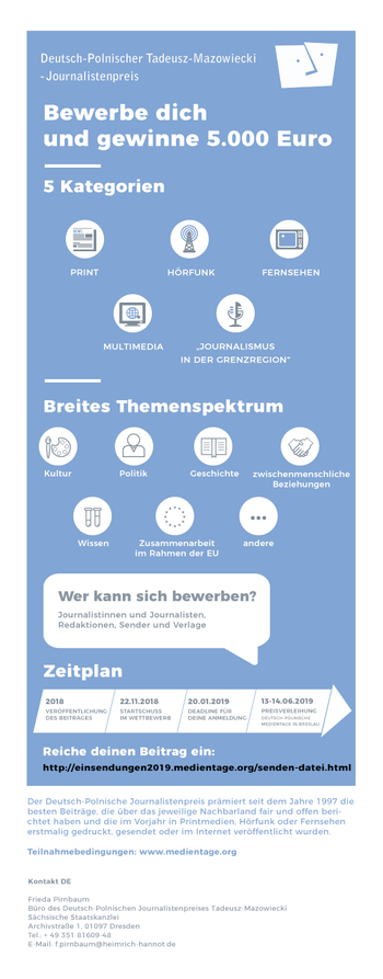Nur noch bis zum 20. Januar können Beiträge für den 22. Wettbewerb um den Deutsch-Polnischen Tadeusz-Mazowiecki-Journalistenpreis eingereicht werden. Kriterien für die Bewertung von Beiträgen in allen Kategorien, Bewerbungsunterlagen und andere Möglichkeiten der Einreichung finden Sie auf der Webseite des Preises. Die Teilnahme am Wettbewerb wird erleichtert durch das neue Online-Anmeldesystem.