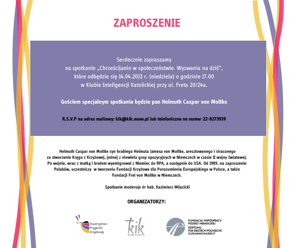 Die Organisatoren möchten – in Anlehnung an den Buchtitel von Anna Morawskas Werk über Dietrich Bonnhoeffer („Dietrich Bonnhoeffer – Ein Christ im Dritten Reich“) und bezugnehmend auf die erste Konferenz in Kreisau – zur Diskussion über die Grundlagen und aktuellen Herausforderungen des Christentums einladen. Das Treffen soll einen kameradschaftlichen Charakter haben, der einen Dialog zwischen den Besuchern und den eingeladenen Teilnehmern erlaubt.