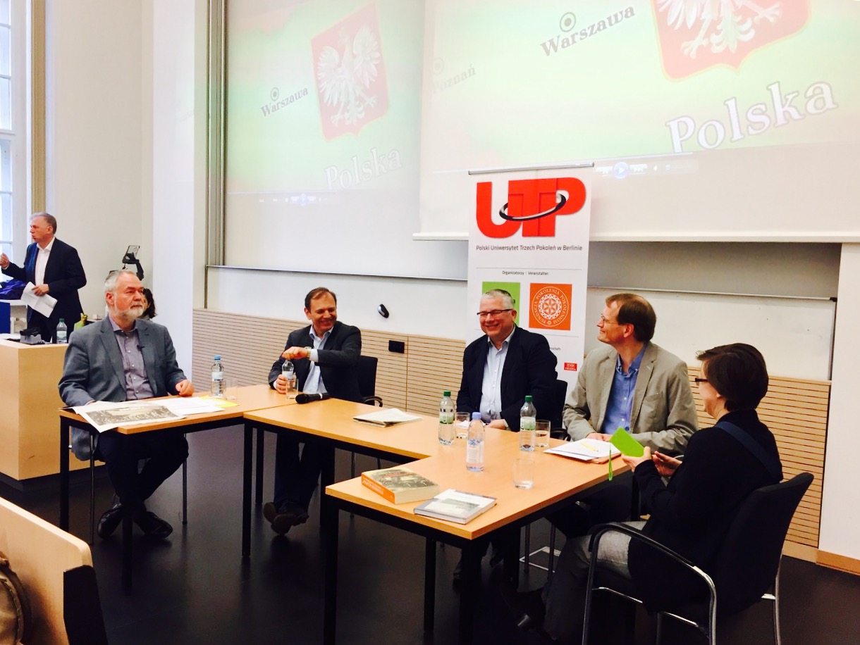 Am 12. Mai 2017 wurde im Rahmen der „Polnischen Universität der Drei Generationen“ die deutsche Ausgabe des Buches „Polen in der Wehrmacht“ von Prof. Ryszard Kaczmarek präsentiert. 150 Gäste waren an diesem Freitagabend erschienen, um unter Anwesenheit des Autors mehr über das Schicksal von etwa 400.000 – 450.000 Polen zu erfahren, die nach dem Überfall auf Polen 1939 für die Wehrmacht zwangsrekrutiert worden waren. Diese Tatsache ist in Deutschland wenig bekannt, in Polen wurde sie lange Zeit tabuisiert. Viele Betroffene verschwiegen nach dem Krieg ihre Wehrmachtsangehörigkeit, um nicht als nationale Verräter geächtet zu werden. Einen Einblick in diese persönliche Perspektive auf das Thema bot dem Publikum ein Ausschnitt aus dem Dokumentarfilm „Großvater war in der Wehrmacht“ von Wioletta Weiß, die anschließend noch bei der von Markus Meckel moderierten Diskussion zu Wort kam. Letzterer hatte die deutsche Übersetzung des Buches von Prof. Kaczmarek initiiert, die dank finanzieller Unterstützung der Stiftung für deutsch-polnische Zusammenarbeit (SdpZ), des Bundesinstituts für Kultur und Geschichte der Deutschen im östlichen Europa (BKGE) und des Volksbundes Deutsche Kriegsgräberfürsorge e.V. ermöglicht wurde. Ihre Expertise und Erfahrungen mit dem Thema teilten an dem Abend daher auch Cornelius Ochmann von der SdpZ und der Historiker Dr. Burkhard Olschowsky vom BKGE.