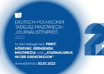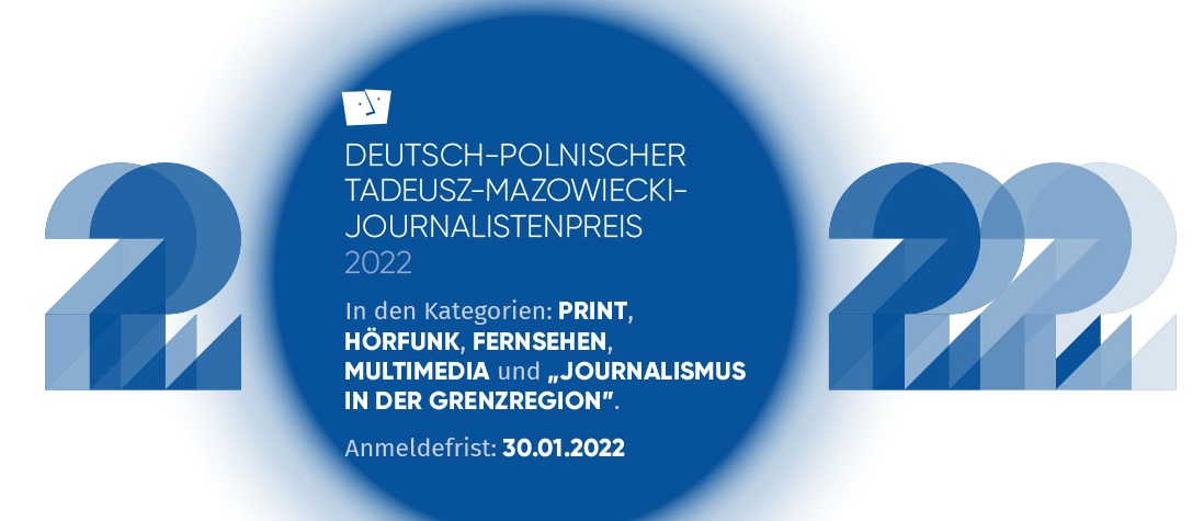 Der Wettbewerb um den Deutsch-Polnischen Tadeusz-Mazowiecki-Journalistenpreis 2022 ist eröffnet. Erneut sind Preisgelder in Höhe von insgesamt 25.000 Euro ausgelobt. Beiträge können in den folgenden Kategorien eingereicht werden: Print, Hörfunk, Fernsehen, Multimedia und „Journalismus in der Grenzregion“. Die Siegerinnen und Sieger werden nach zwei Jahren virtueller Preisvergabe wieder bei der Live-Gala am 9. Juni 2022 in der Europastadt Görlitz-Zgorzelec prämiert. Die Deutsch-Polnischen Medientage finden am 9./10. Juni 2022 in Görlitz-Zgorzelec statt.