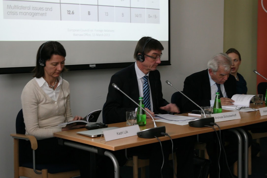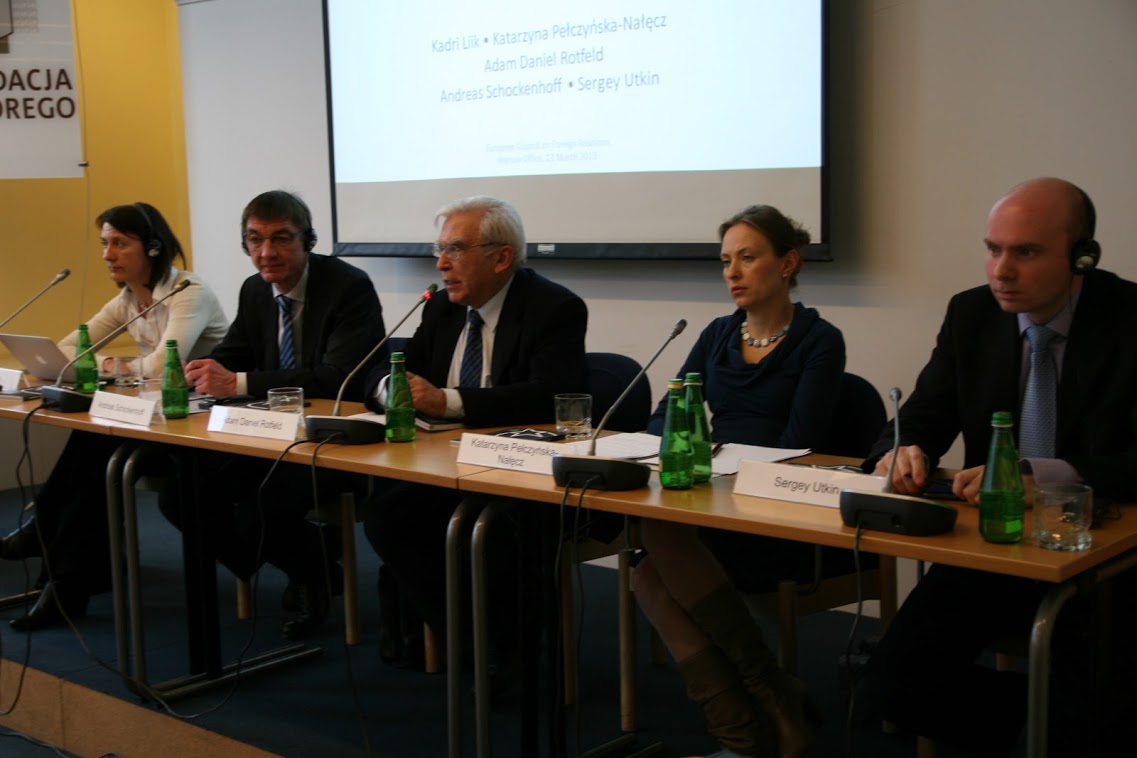 Am 13. März 2013 fand im ECFR (European Council on Foreign Relations) in Warschau eine Diskussion mit dem Titel „Die EU gegenüber Russland: friedlicher – aber erfolgreicher?“ statt. Teilnehmer waren die ECFR-Programmchefin von „Größeres Europa“ Kadri Liik, der CDU-Bundestagsabgeordnete und Russlandexperte Andreas Schockenhoff, die Staatsministerin im polnischen Außenministerium und ehemalige Vizedirektorin des OSW (Centre for Eastern Studies) Katarzyna Pełczyńska-Nałęcz sowie der Europaexperte am Institut für Weltwirtschaft und Internationale Beziehungen der Russischen Akademie der Wissenschaften Siergiej Utkin. Die Debatte wurde vom ehemaligen Außenminister Adam Daniel Rotfeld moderiert, der Ko-Vorsitzender der russisch-polnischen Kommission für schwierige Fragen und Ratsmitglied des ECFR ist.