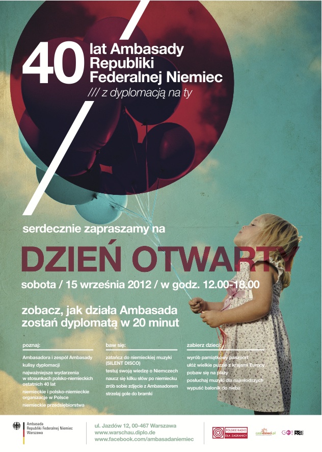 Der am 15. September 2012 stattfindende Tag der offenen Tür bietet den Besuchern eine gute Gelegenheit, hinter die Kulissen der Deutschen Botschaft in Warschau zu schauen, mit dem Botschafter Gespräche zu führen und die Räumlichkeiten seiner Residenz zu besichtigen. Darüber hinaus werden die Gäste Informationen über die Tätigkeitsbereiche deutscher Unternehmen, Stiftungen und deutsch-polnischer Organisationen sowie über Studien-, Stipendien- und Austauschprogramme in Deutschland erhalten.