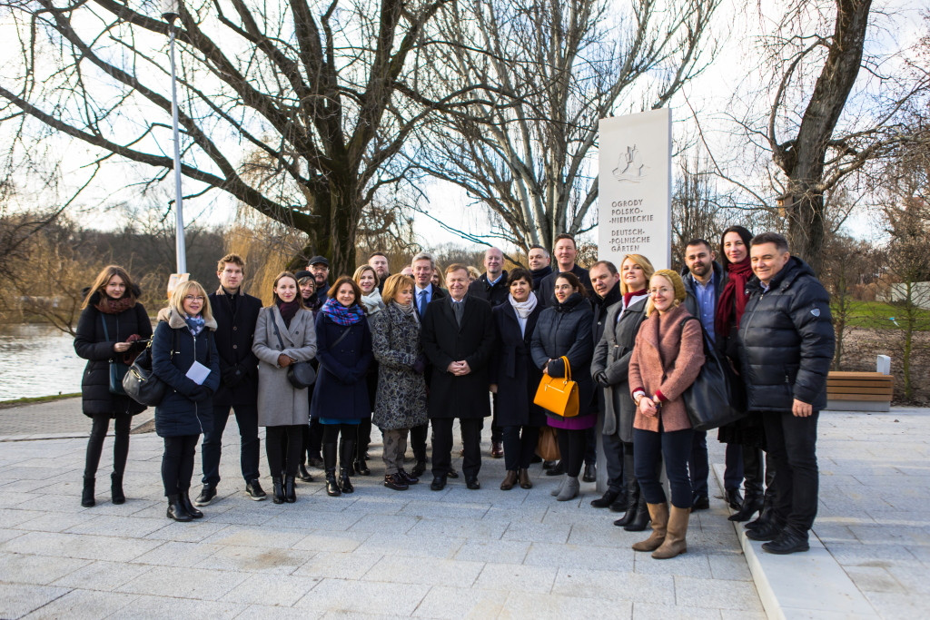 Im Februar 2020 versammelten sich über zwanzig Mäzene, Partner und Freunde der Deutsch-Polnischen Gärten, Vertreter sowohl von Partnerfirmen als auch privater Förderer, zur Präsentation des jüngst fertiggestellten Einganges in die Gärten von der Seite der ul. Międzynarodowa. Hier gibt es einen großzügigen Eingangsbereich mit Fahrradständern und Sitzgelegenheiten. Auch zwei neue Bäume (Sorbus arnoldiana ‘Golden Wonder‘) konnten dank ihrer Schirmherren gepflanzt werden.