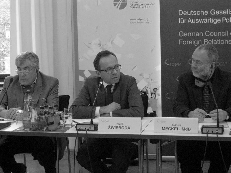 Der Gastredner, Paweł Świeboda, Vorstandsvorsitzender des Zentrums für Europäische Strategien demosEuropa aus Warschau, stellte sich darüber hinaus zahlreichen Fragen zur weiteren Erweiterung der Europäischen Union, zu den Perspektiven der gemeinsamen europäischen Außenpolitik, zur Östlichen Partnerschaft sowie zur Zukunft des Weimarer Dreiecks. Der Gesprächskreis Polen ist eine gemeinsame Initiative der Deutschen Gesellschaft für Auswärtige Politik und der Stiftung für deutsch-polnische Zusammenarbeit. Der Vorsitzende des Gesprächskreises ist Markus Meckel, MdB.