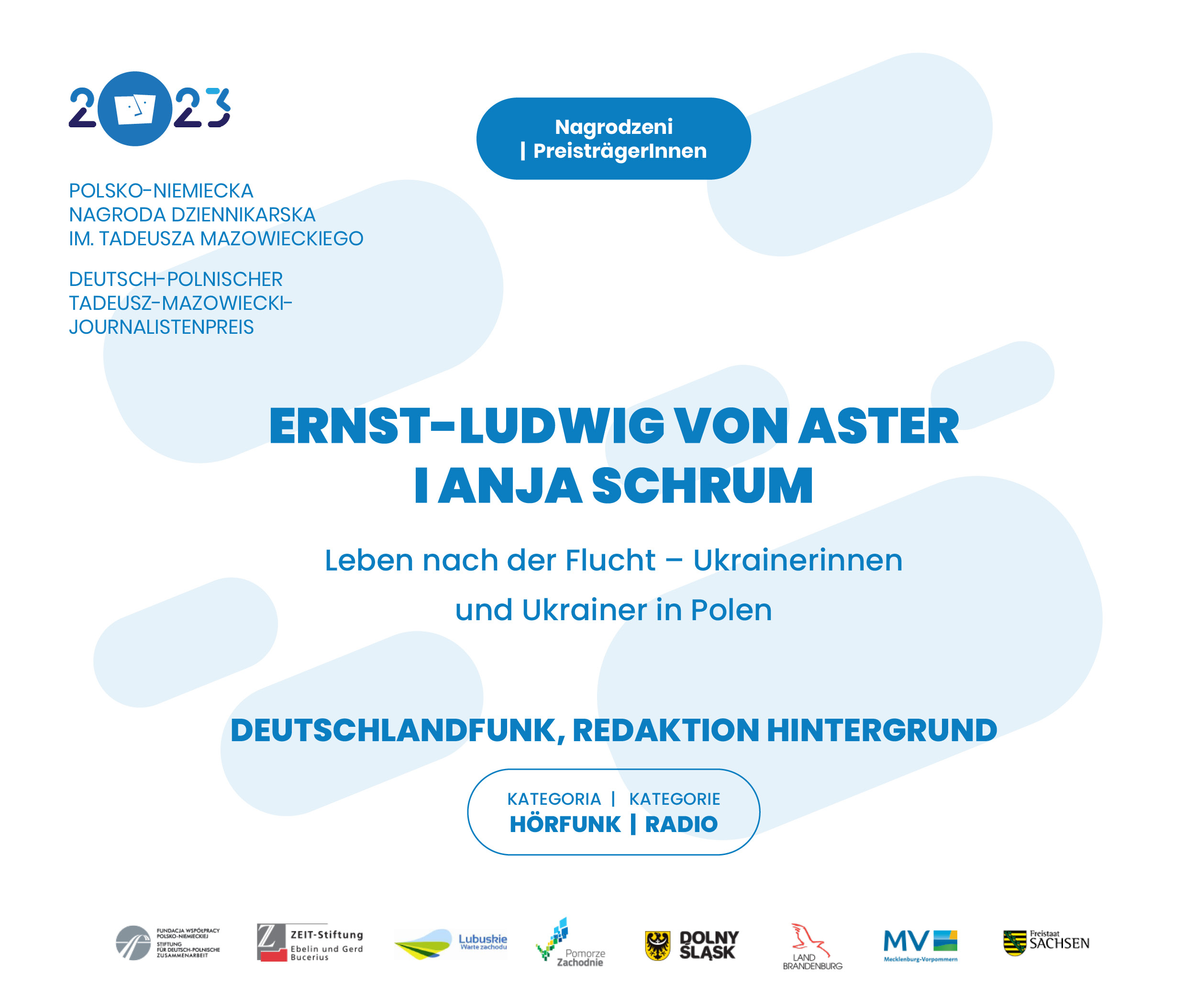 Ernst-Ludwig von Aster und Anja Schrum bekamen den Preis für den Beitrag „Das Leben nach der Flucht – Ukrainerinnen und Ukrainer in Polen“, gesendet im Deutschlandfunk in der Sendung „Hintergrund“. Überreicht wurde der Preis von Dietmar Nietan, dem Koordinator der Bundesregierung für die deutsch-polnische zwischengesellschaftliche und grenznahe Zusammenarbeit. „Die im Beitrag vorgestellten Schicksale der vor dem Krieg geflüchteten Menschen aus der Ukraine, die enorme Unterstützungsbereitschaft der polnischen Gesellschaft, aber auch die alltäglichen Schwierigkeiten nach der Ankunft in Polen, die Hoffnungen auf eine Normalisierung des Lebens und der Mut, anzukommen und das Leben neu anzufangen, ist eine herausragende und bewegend erzählte Reportage“, – sagte Dietmar Nietan.