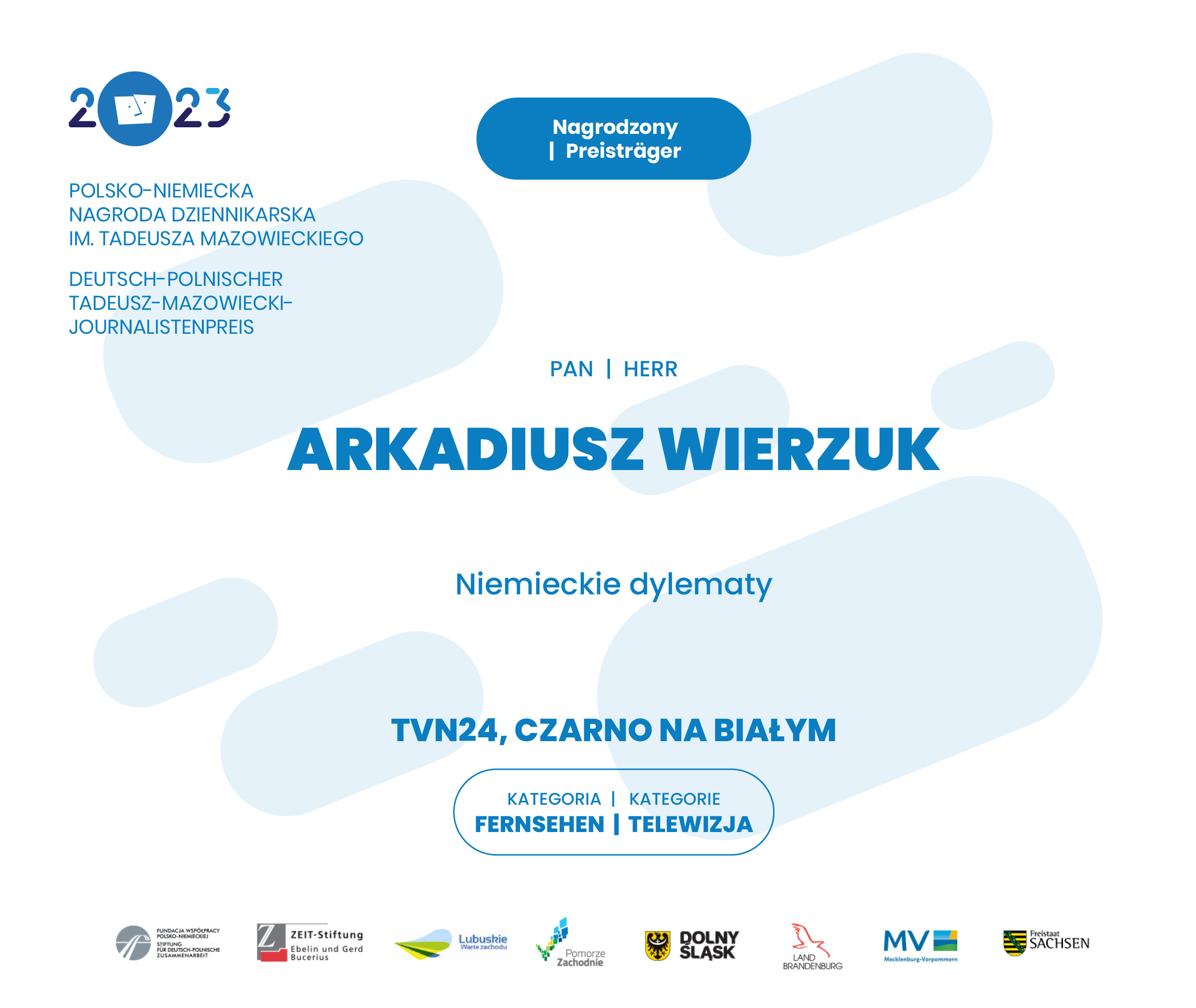 Die Ausrichter des diesjährigen Wettbewerbs und der 16. Deutsch-Polnischen Medientage – die Stiftung für deutsch-polnische Zusammenarbeit, die ZEIT-Stiftung Ebelin und Gerd Bucerius und die Woiwodschaft Lebuser Land – sowie die weiteren Stifter des Preises – die Bundesländer Brandenburg, Mecklenburg-Vorpommern, der Freistaat Sachsen und die Woiwodschaften Westpommern und Niederschlesien – gratulieren allen Preisträgerinnen und Preisträgern in den fünf Kategorien recht herzlich.