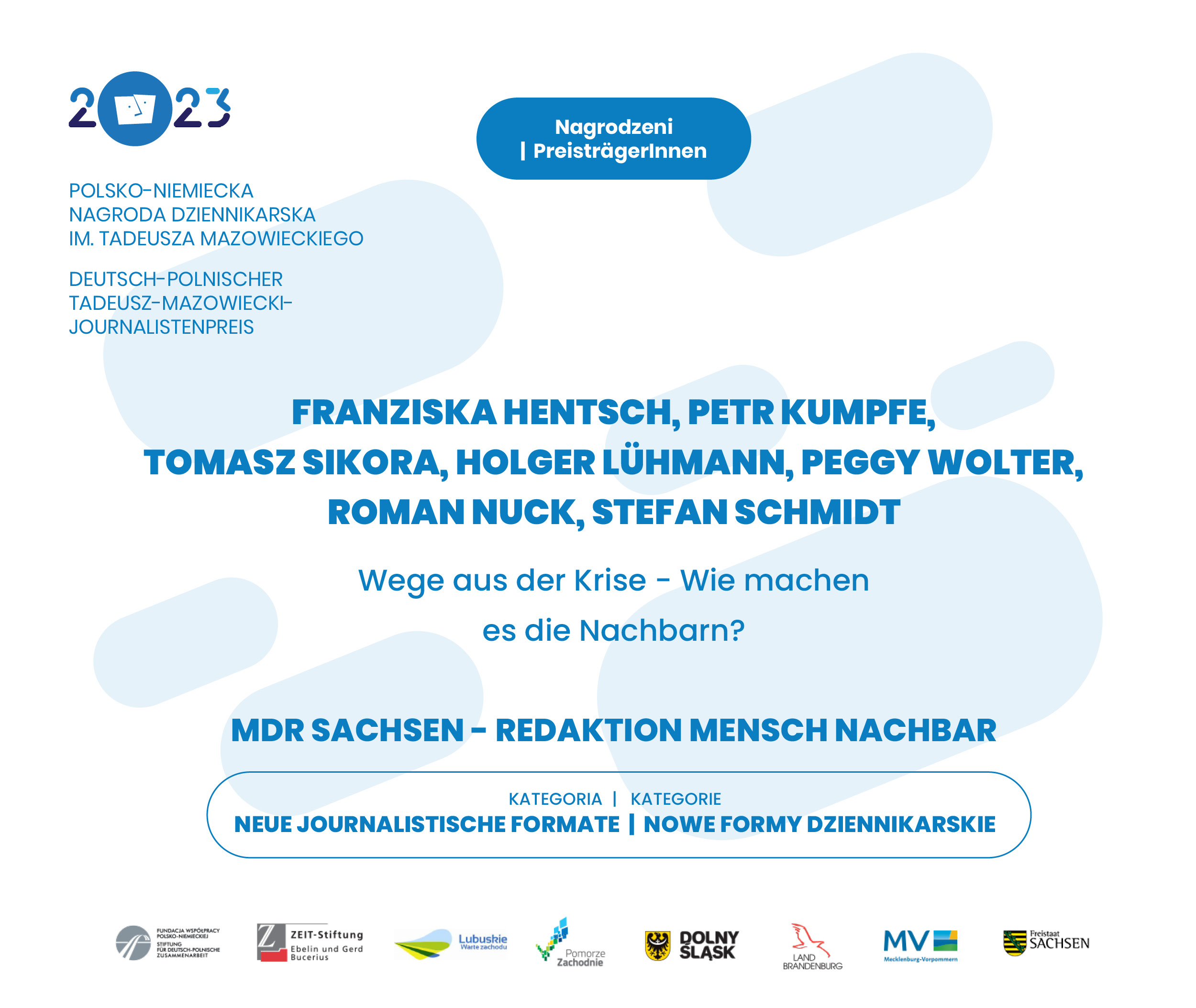 Der Deutsch-Polnische Journalistenpreis in dieser Kategorie ging an das MDR Sachsen-Team von der Redaktion „Mensch Nachbar“, bestehend aus Franziska Hentsch, Petr Kumpfe, Tomasz Sikora, Holger Lühmann, Peggy Wolter, Roman Nuck, Stefan Schmidt.