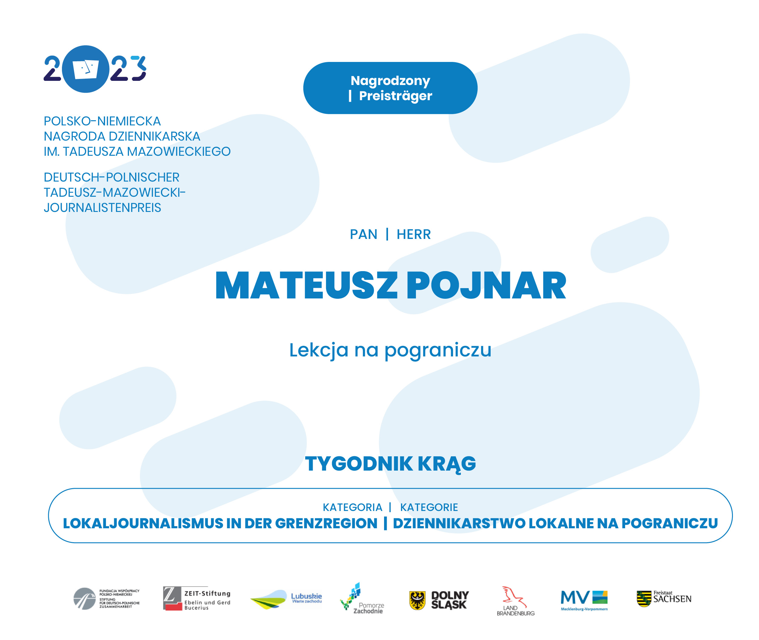 Der Juror für die Kategorie Print Marcin Torz pries in seiner Laudatio: „Die Geschichtsstunde an der Grenze” zeigt sehr gut, wie viel Arbeit den Nachbarn Deutschland und Polen noch bevorsteht – Arbeit, die zu gegenseitigem Verständnis, Vertrauen, aber auch zu einer wirksameren Zusammenarbeit führen wird.“