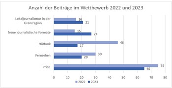Von den 150 eingereichten Beiträgen sind 65 Printbeiträge (25 deutsche und 40 polnische), 17 Hörfunkbeiträge (8 deutsche und 9 polnische), 20 Fernsehbeiträge (17 deutsche und 3 polnische), 27 Beiträge in der Kategorie Neue journalistische Formate (16 deutsche und 11 polnische) sowie 21 Beiträge in der Kategorie „Lokaljournalismus in der Grenzregion“ (10 deutsche und 11 polnische). Im Vorjahr waren insgesamt 183 Beiträge gezählt worden.