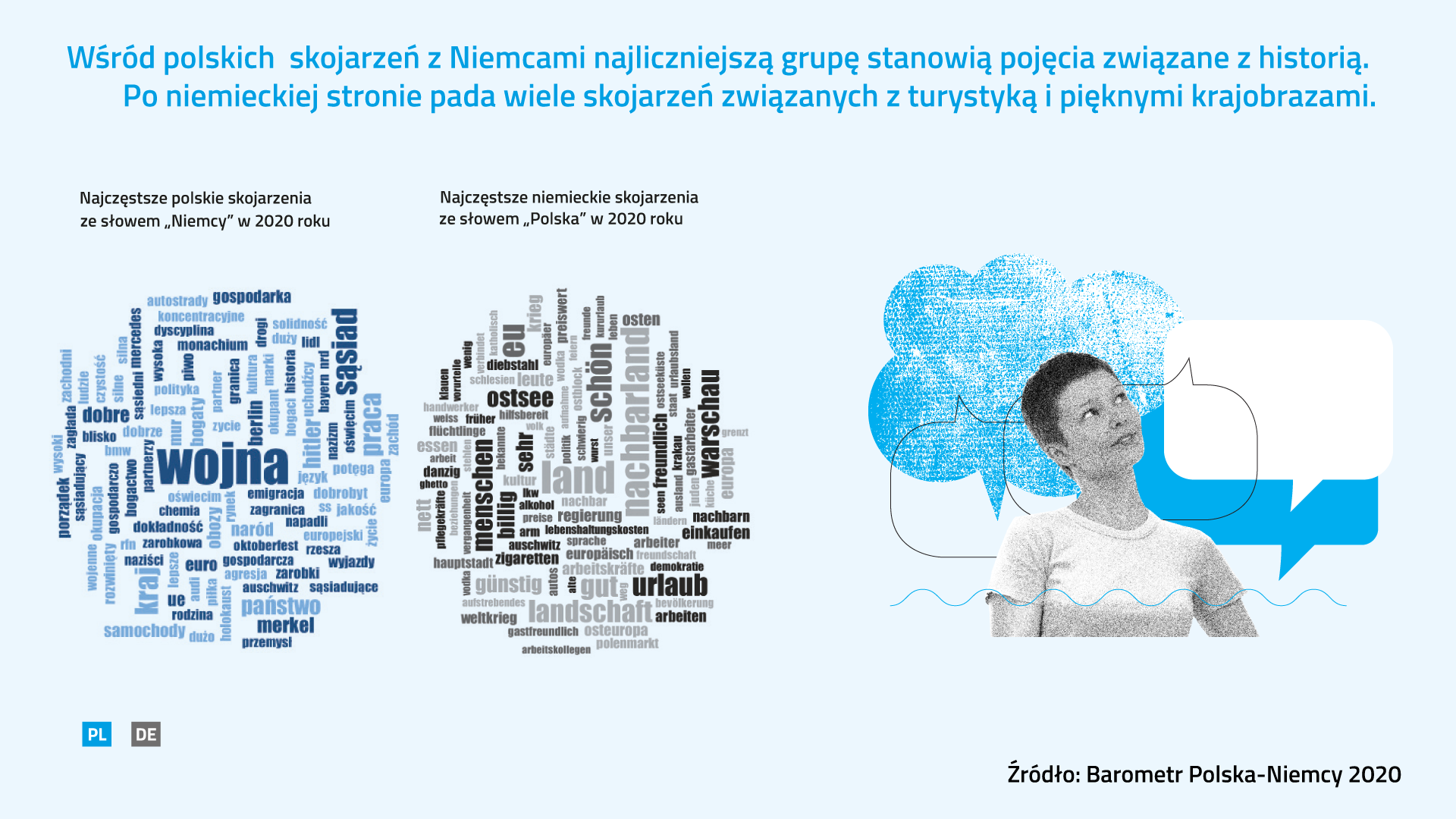 Fast ein Drittel aller Assoziationen der Polen zu Deutschland sind mit dem Thema Krieg verbunden (30%). Stichworte, wonach sich Deutschland durch eine starke Wirtschaft und Wohlstand auszeichnet, machen 14 Prozent der polnischen Assoziationen aus; acht Prozent beziehen sich auf Kultur, Tourismus und Sprache. Mit letzteren Bereichen sind wiederum auf deutscher Seite mit Blick auf Polen die meisten Assoziationen verknüpft (29%); mit Geschichte verbundene Assoziationen machen demgegenüber einen Anteil von sieben Prozent aus. „Es ist sehr erfreulich, dass Polen für Deutsche immer mehr ein attraktives Land für Touristen wird, verbunden mit schönen Orten und Erholung", kommentiert das Ergebnis Dr. Agnieszka Łada vom Deutschen Polen-Institut, die Ko-Autorin der Untersuchung. "Auf polnischer Seite hingegen gibt es eine deutliche Zunahme emotionaler Assoziationen, die mit dem schwierigsten Kapitel unserer gemeinsamen Geschichte verbunden sind – seit 2016 ist der Anteil dieser Assoziationen von 21 Prozent gestiegen. Die Polen denken zudem immer seltener an Deutschland als ein Land mit einem höheren Lebens- und Entwicklungsstandard“, so Łada.