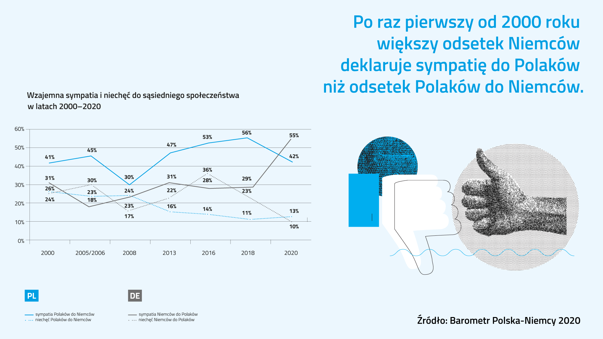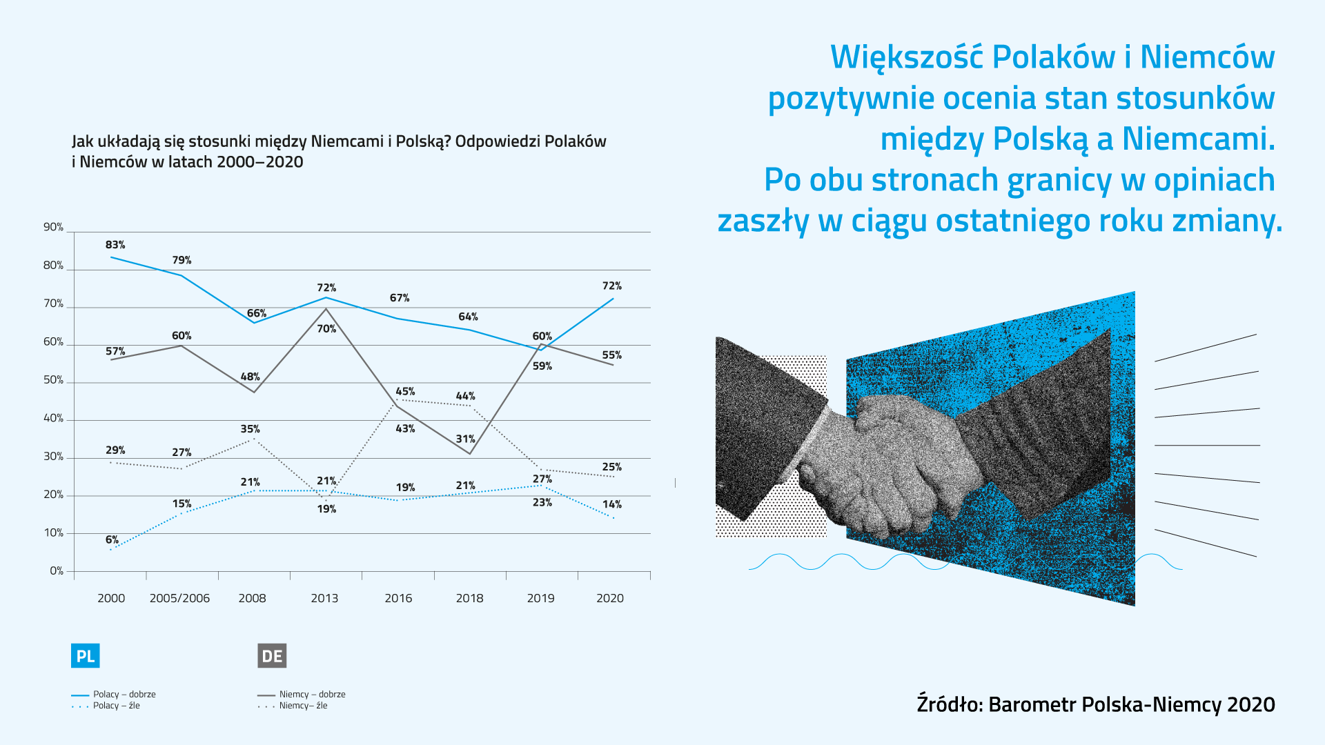Die deutsch-polnischen Beziehungen werden von 55 Prozent der Deutschen und 72 Prozent der Polen als gut erachtet, von 25 Prozent bzw. 14 Prozent hingegen als schlecht. Auf polnischer Seite bedeutet dies eine Verbesserung im Vergleich zum Vorjahr. Die deutschen Bewertungen bleiben mit der Verschlechterung um fünf Prozentpunkte demgegenüber relativ stabil, allerdings bei einem sichtbaren Anstieg des Anteils der Unentschiedenen – dieser beläuft sich mittlerweile auf 20 Prozent.