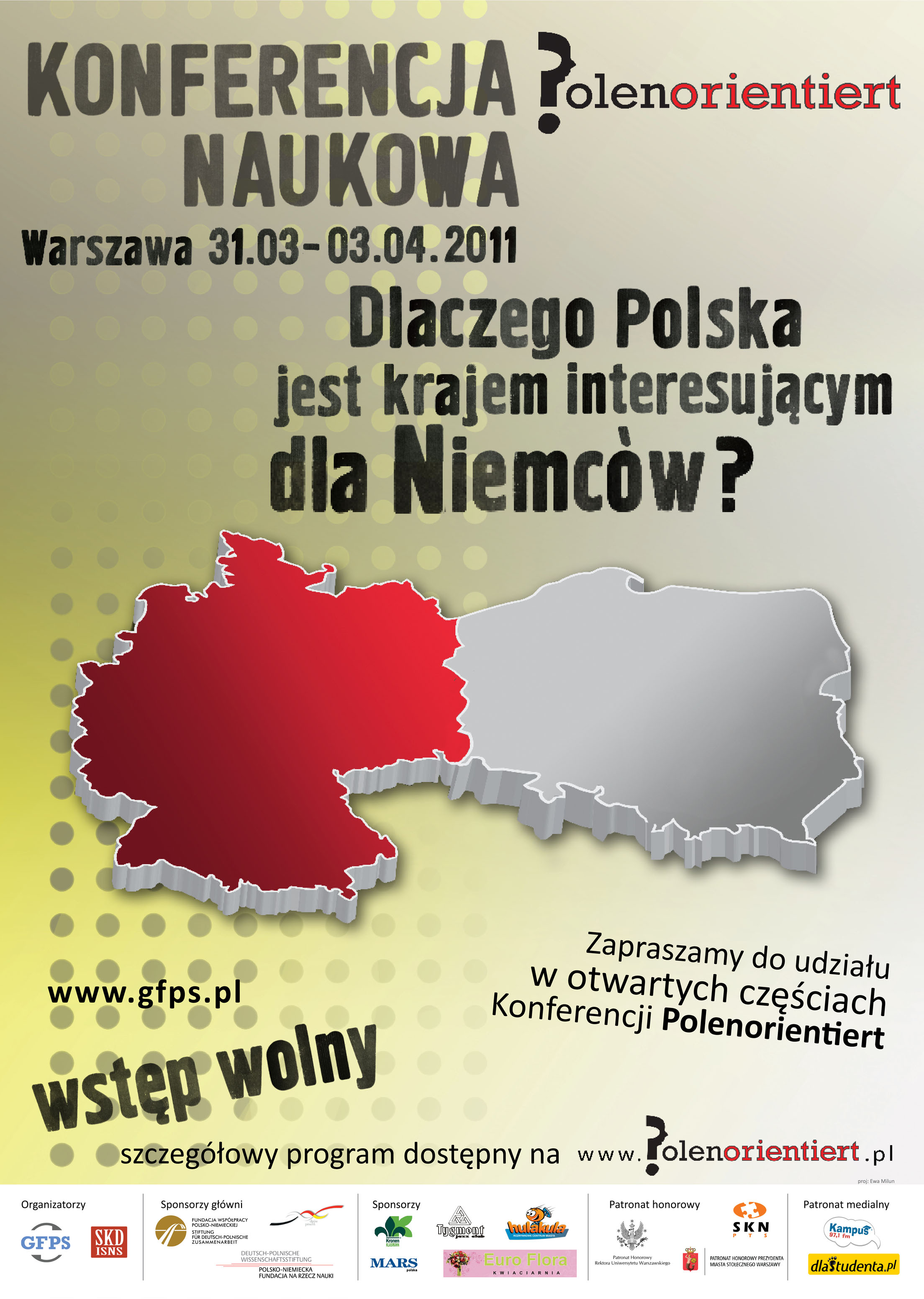 In den letzten Jahren ist die Anzahl Deutscher, die Polnisch lernen und Polen besuchen, deutlich gestiegen. Aus diesem Grunde befasst sich die Konferenz mit der Frage: „Warum interessieren sich immer mehr Deutsche für Polen?” Den Schwerpunkt der Konferenz sollen Vorträge bilden, die von 18 jungen Wissenschaftlern aus Deutschland und Polen referiert werden. Teilnehmen sollen Nachwuchswissenschaftler, die sich mit den Beziehungsstrukturen beider Staaten untereinander auseinandersetzen, sich für die jeweils andere Kultur oder eine gegenseitige Zusammenarbeit interessieren. Während der Konferenz hat sowohl GFPS-Polska als auch der Kreis der teilnehmenden Wissenschaftler die Gelegenheit, ihre Tätigkeiten vorzustellen und weitere Teilnehmer zu Aktivitäten zugunsten der deutsch-polnischen Partnerschaft zu ermuntern.