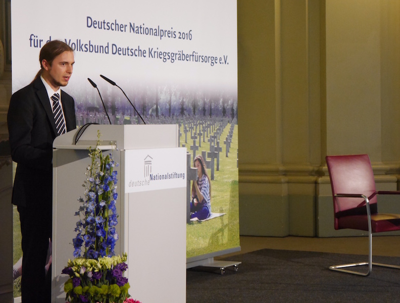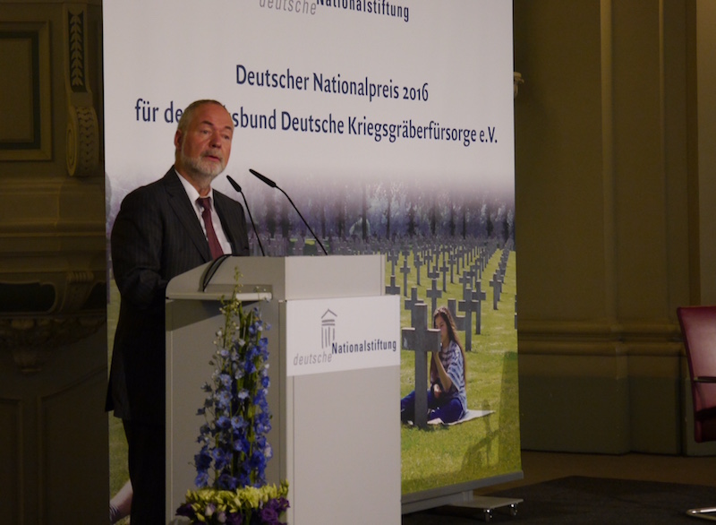 Die Deutsche Nationalstiftung hat den Volksbund Deutsche Kriegsgräberfürsorge e. V. am 15. Juni für seine Gedenk-, Bildungs- und Jugendarbeit mit dem Deutschen Nationalpreis 2016 ausgezeichnet. Zur offiziellen Verleihung des mit 50 000 Euro dotierten Preises waren rund 400 Vertreter des öffentlichen Lebens in die Französische Friedrichstadtkirche in Berlin gekommen.