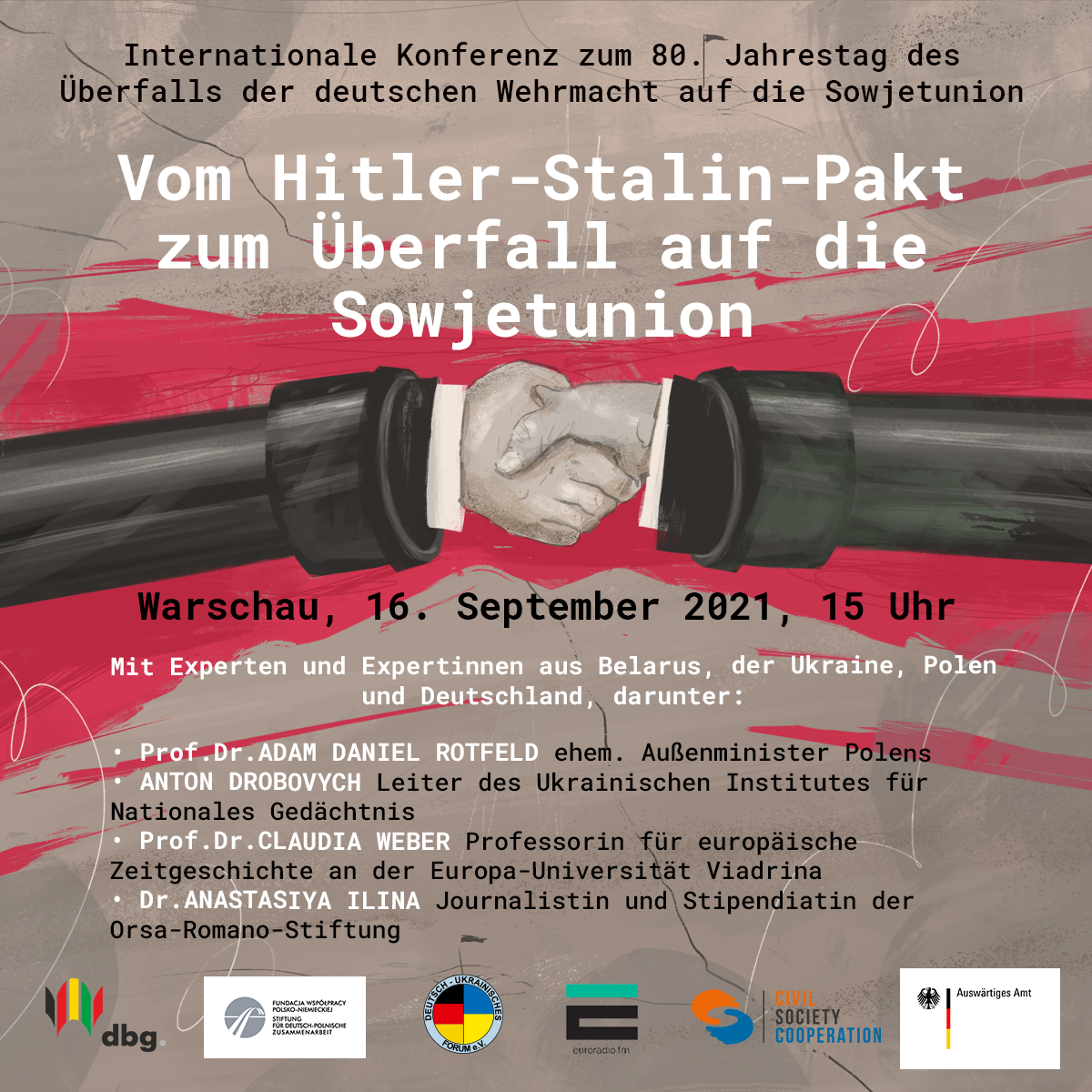 Mit der internationalen Konferenz „Vom Hitler-Stalin-Pakt zum Überfall auf die Sowjetunion“ möchten die deutsch-belarussische gesellschaft e.V., die Stiftung für deutsch-polnische Zusammenarbeit und das Deutsch-Ukrainische Forum e.V. dieser folgenschweren Ereignisse in ihren komplexen Verstrickungen zusammen darstellen und sie mit Fokus auf die Schicksale von Belarus und der Ukraine reflektieren.
