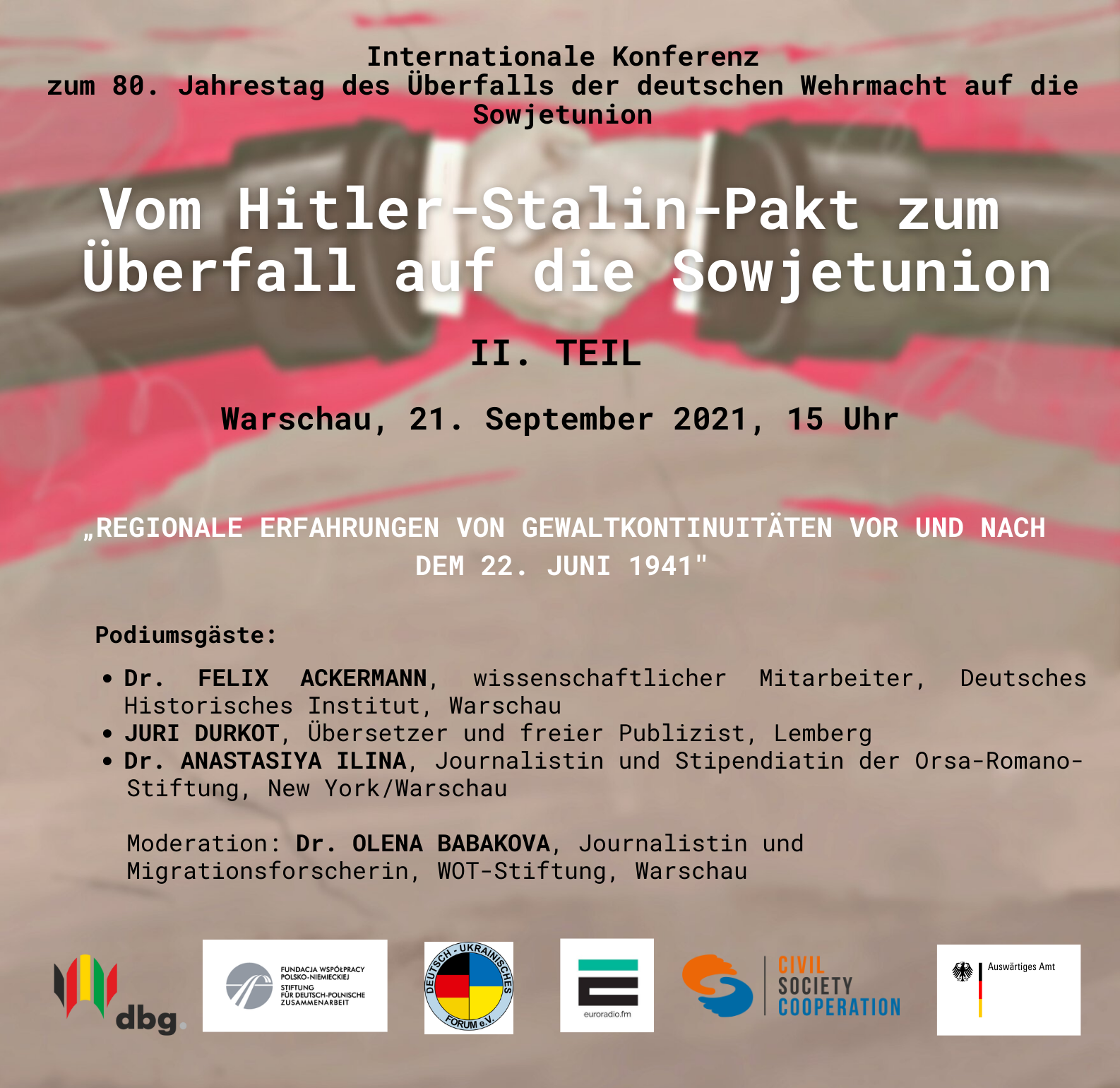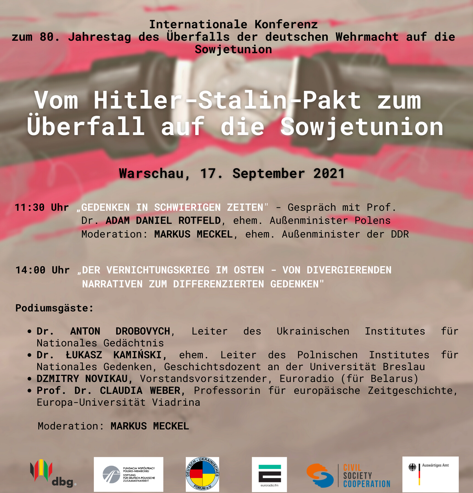 Mit der internationalen Konferenz „Vom Hitler-Stalin-Pakt zum Überfall auf die Sowjetunion“ haben die deutsch-belarussische gesellschaft e.V., die Stiftung für deutsch-polnische Zusammenarbeit und das Deutsch-Ukrainische Forum e.V. versucht, diese folgenschweren Ereignisse in ihren komplexen Verstrickungen zusammen darzustellen und sie mit Fokus auf die Schicksale von Belarus und der Ukraine zu reflektieren.