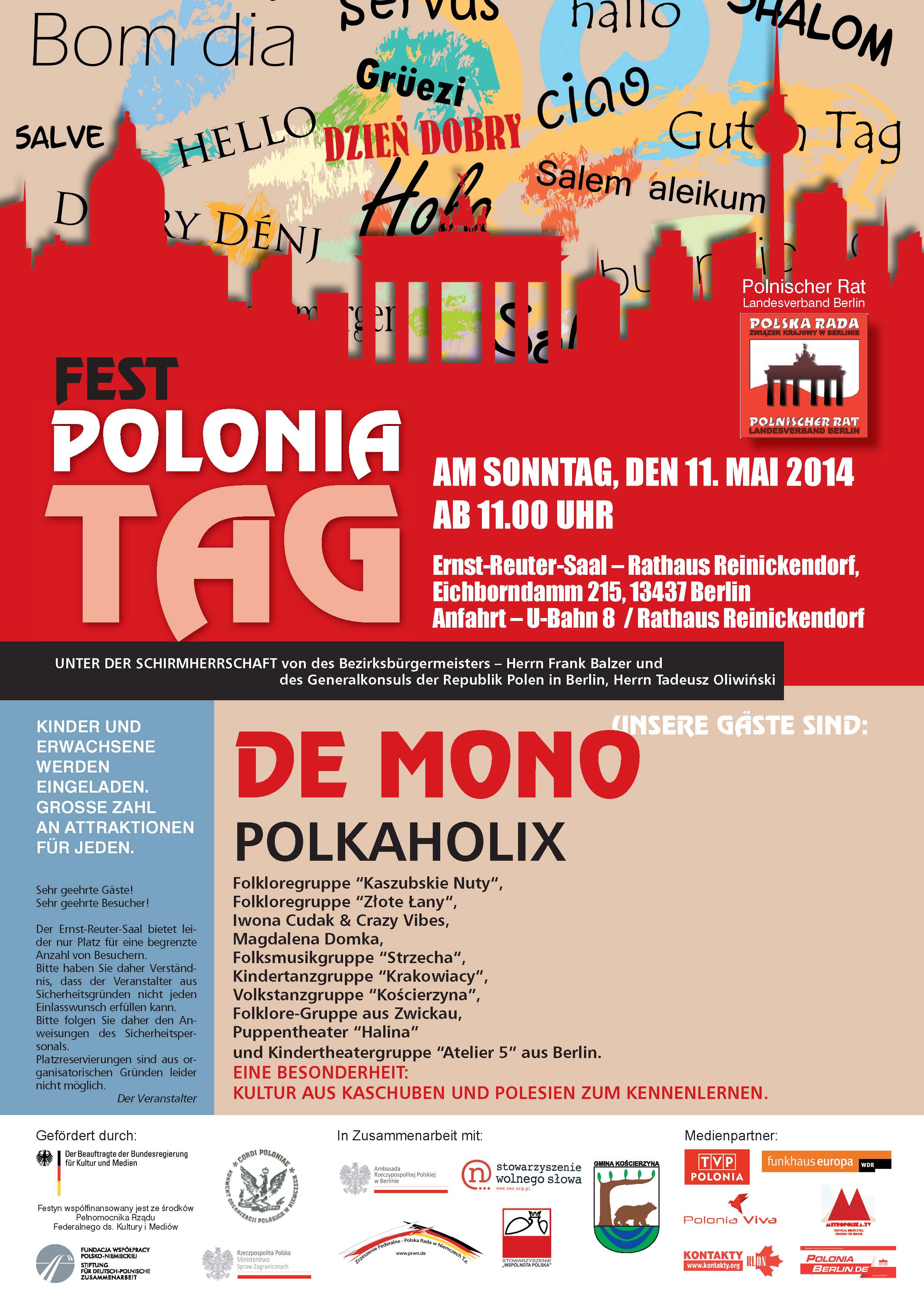 Zu diesem Familienfest aus dem Anlass des „Tages der Polonia“ laden die Organisatoren am Sontag, den 11. Mai ab 11.00 Uhr zum Rathaus Berlin-Reinickendorf, Eichborndamm 215, U-Bahn-Station „Rathaus Reinickendorf“ (U8) ein. Das Fest wird veranstaltet von den Polonia-Organisationen aus dem Polnischen Rat, Landesverband Berlin, und wird finanziert aus den Mitteln des Beauftragten der Bundesregierung für Kultur und Medien, des Polnischen Außenministeriums, der Stiftung für Deutsch-Polnische Zusammenarbeit und des Konvents Polnischer Organisationen in Deutschland.