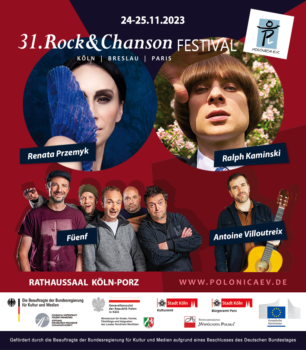 31. Rock&Chanson Festival „Köln-Breslau-Paris“ am 24. 11.und 25.11. 2023 in Köln mit namhaften Künstlern wie RALP KAMINSKI und RENATA PRZEMYK (PL), die A,Cappella Band „Füenf“ (D) und ANTOINE VILLOUTREIX (F) sowie zahlreichen talentierten Jungen Künstlern aus Deutschland, Polen und Frankreich.