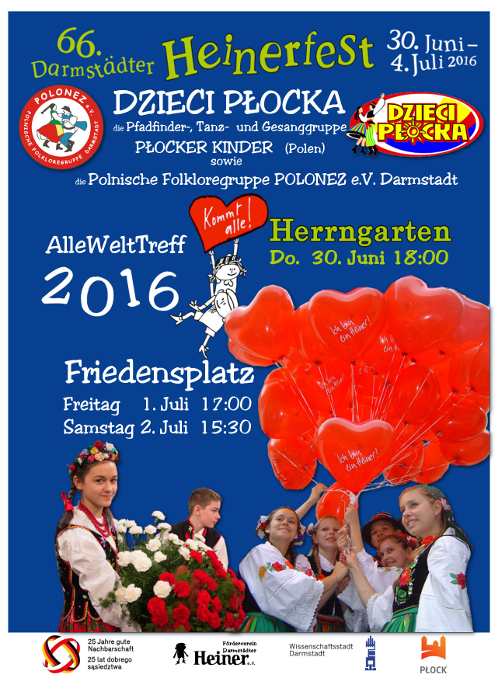 Das Motto des Heinerfest – AlleWeltTreffs ist in diesem Jahr das Jubiläum „25 Jahre gute deutsch-polnischen Nachbarschaft“. Das Konzert des Ensembles DZIECI PLOCKA findet am 1. Juli um 17:00 Uhr auf dem Friedensplatz in Darmstadt statt. Das Ensemble DZIECI PLOCKA ist das älteste Kinderfolkloreensemble in Polen. Die Gruppe gewann zahlreiche Preise und Auszeichnungen und belegte erste Plätze bei vielen Festivals.