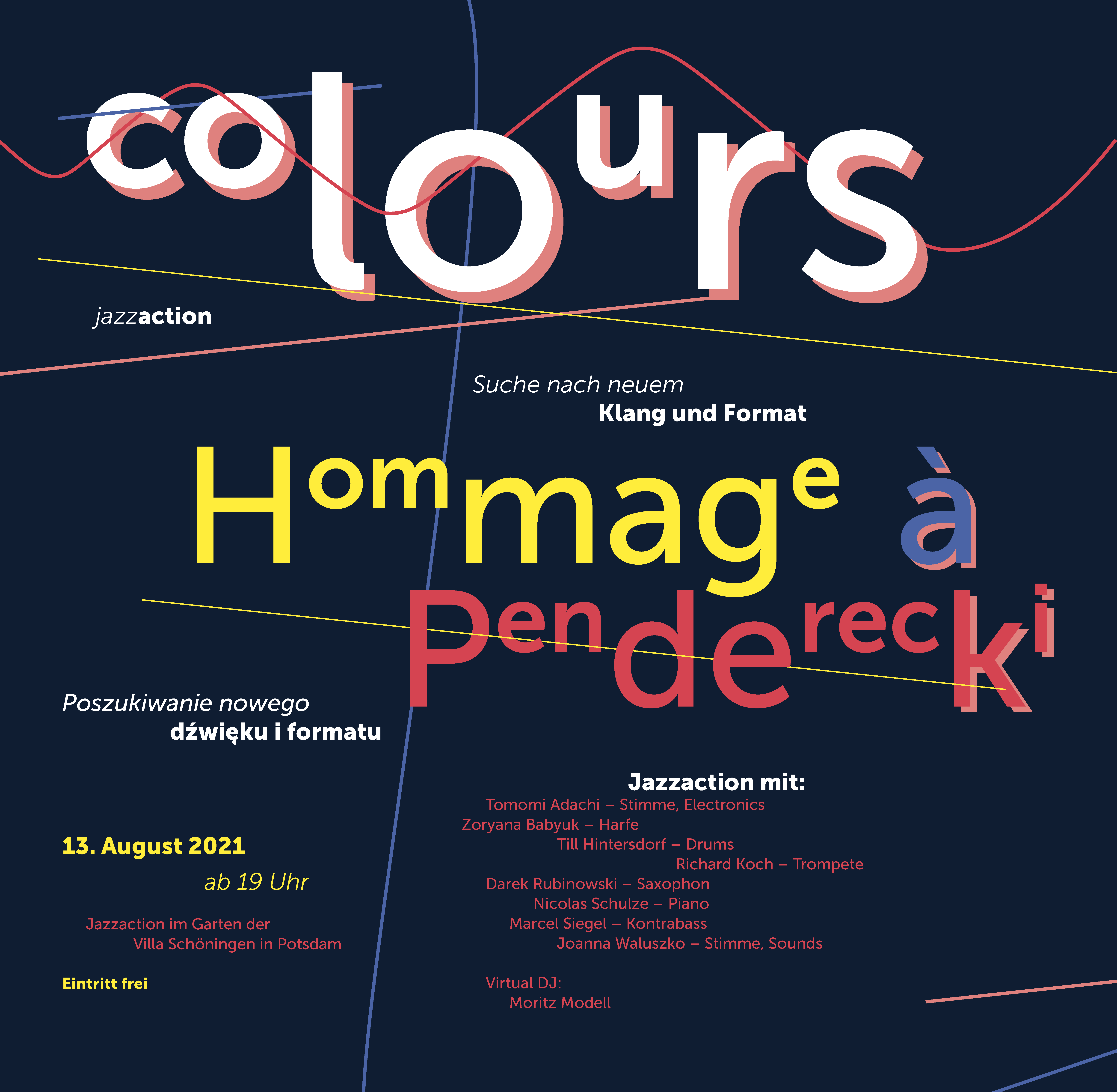 Ausgangspunkt für die Jazzaction ist das Stück „Colours“, Ergebnis des Open Calls penderecki@home des Vereins Freundliche Übernahme Rechenzentrum aus Potsdam. Im März wurde dazu eingeladen, das Stück Actions for Free Jazz Orchestra, das einzige Jazz-Werk von Krzysztof Penderecki, in Form freier Komposition zu erkunden und neu zu interpretieren. Mehr als sechzig Kompositionen aus Deutschland und Polen wurden eingesandt und überraschten mit einer einzigartigen musikalischen Vielfalt. Aus diesem Instrumentarium haben die Komponisten Joanna Waluszko und Nicolas Schulze eine Klangkomposition arrangiert, den Videoclip zu »Colours« erstellte Animationskünstlerin Yeni Harkányi. Das Ergebnis des finden Sie auf YouTube:
