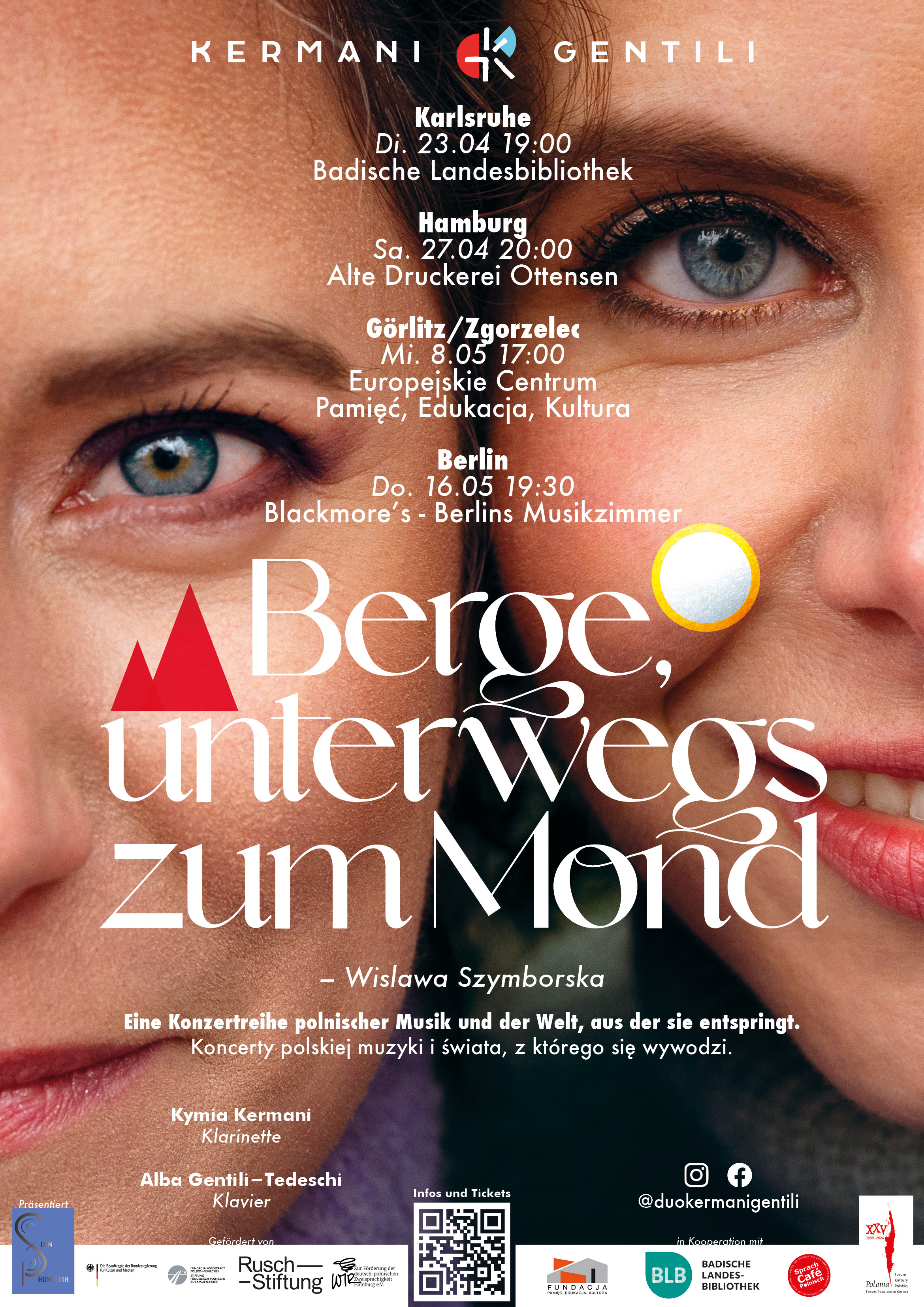 Das Duo Kermani-Gentili spielt seit über einem Jahrzehnt zusammen und widmet sich sowohl den berühmtesten Meisterwerken des Repertoires für Klarinette und Klavier, als auch innovativer Programmgestaltung und Musikperlen weniger bekannter Komponist:innen. Das Projekt “Berge unterwegs zum Mond” ist das Ergebnis ihrer Recherche polnischer Musik und der Welt, aus der sie entspringt.