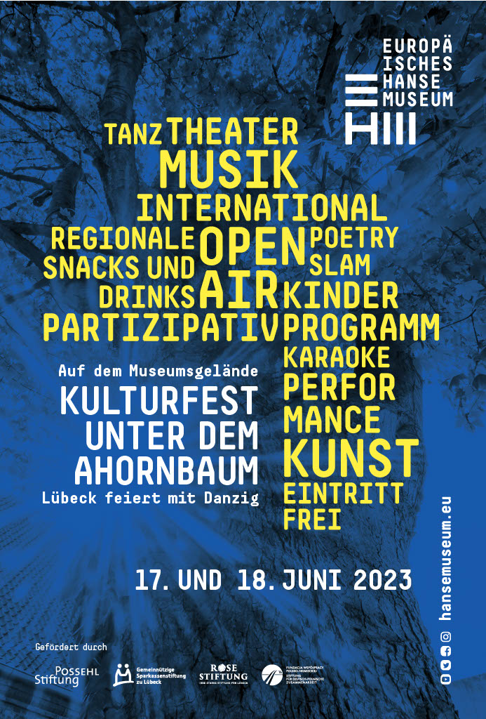Am Samstag, 17. Juni, und Sonntag, 18. Juni 2023, treffen Künstler:innen und Kulturschaffende aus Danzig und Lübeck unter dem Ahornbaum im Innenhof des Europäischen Hansemuseums aufeinander und bieten ein vielfältiges Programm aus den Bereichen aktueller Musik, Theater, moderner Tanz, Bühnenliteratur, Film und Performance.