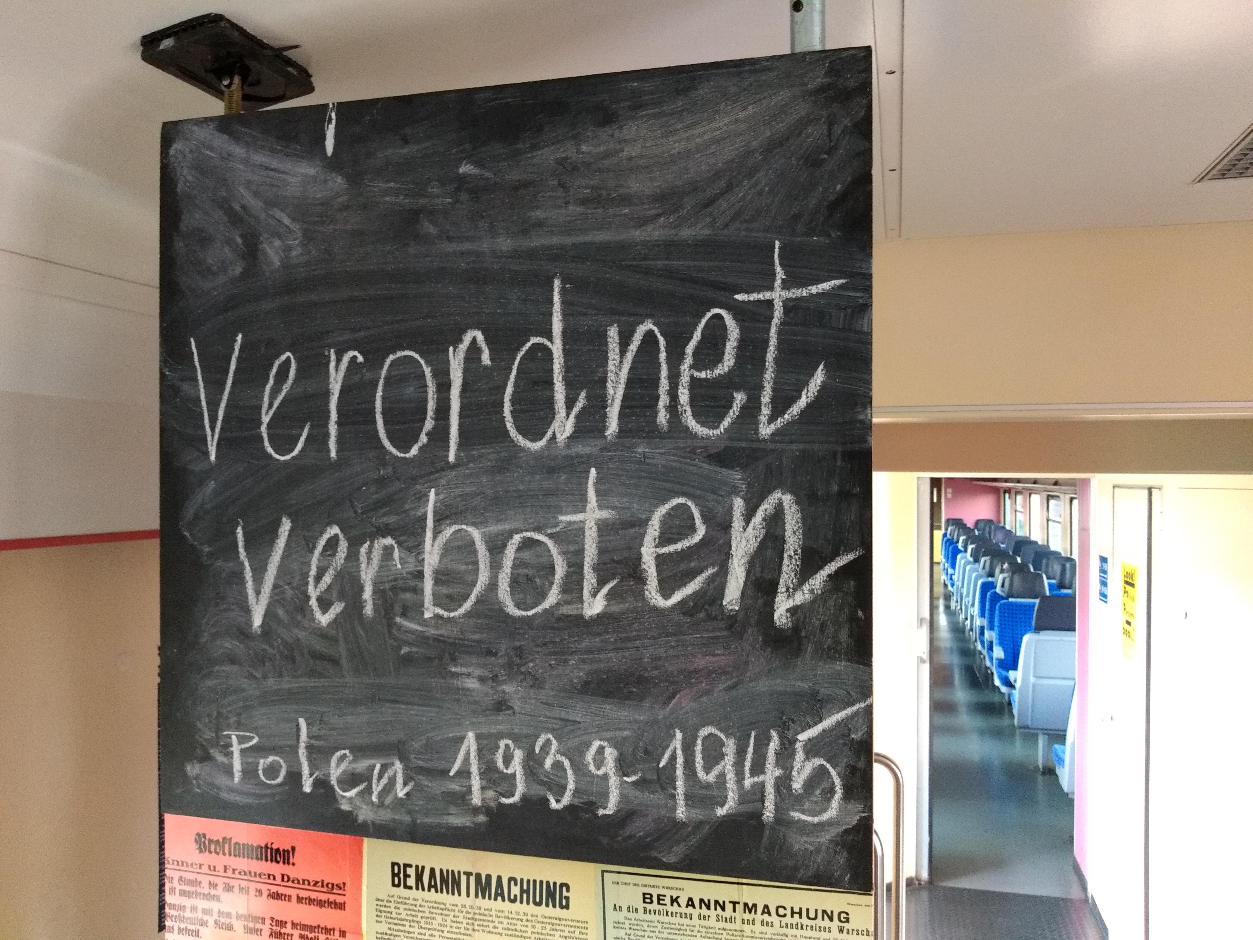 Die Ausstellung “Wir ordnen an, verbieten, machen bekannt, Einblicke in den Alltag unter deutscher Okkupation“ ist Teil der Veranstaltungsreihe "Verlorene Heimat – besetzt und ausgeliefert". Sie reflektiert anlässlich des 80. Jahrestags des Überfalls auf Polen Fragen nach Heimatverlust und Identität in Zeiten, wo das Fremde im eigenen Land herrscht. Das interdisziplinäre Programm vereint unterschiedliche künstlerische Perspektiven für die Fahrgäste im Kulturzug, die zum Erinnern aktivieren.